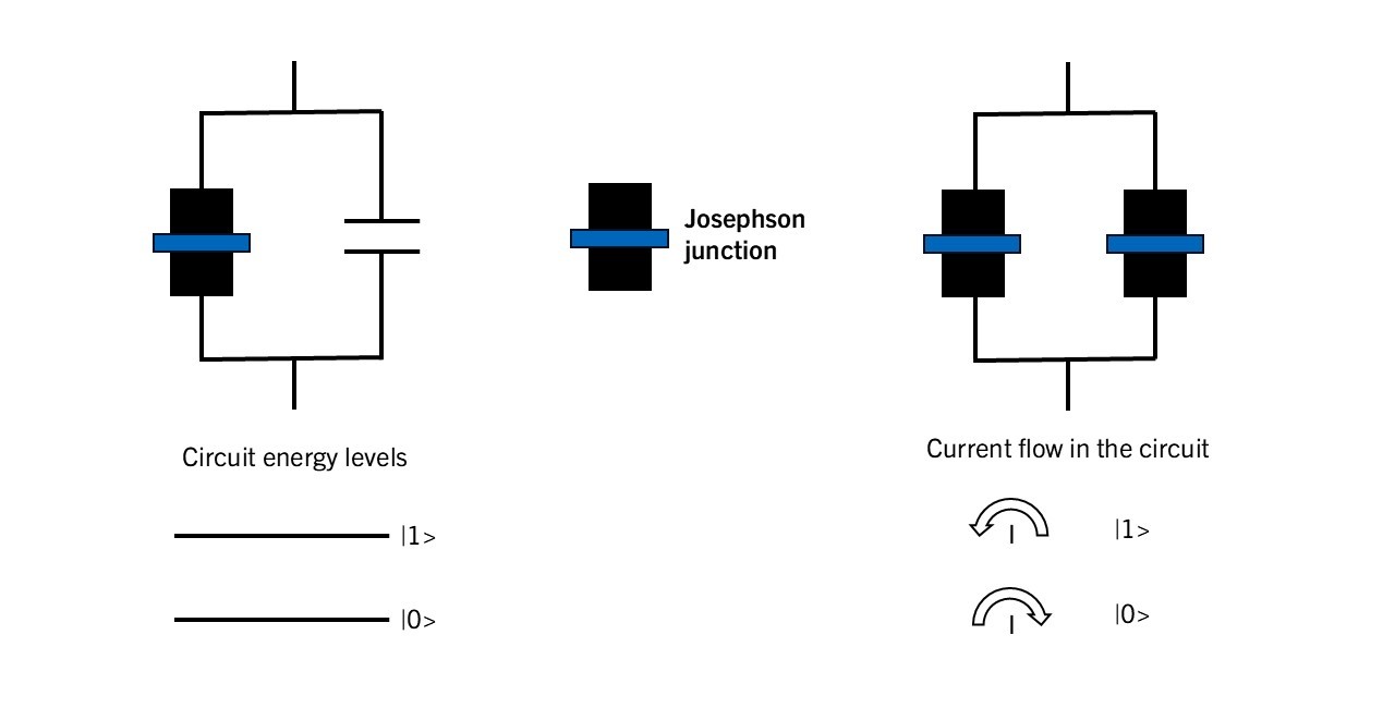 Josephson junctions are thin, insulating barriers positioned between superconducting materials, which can be used to create a variety of different qubits, including transmon qubits and flux qubits. Transmon qubits are created by connecting a Josephson junction in parallel with a relatively large capacitor. This creates a non-linear LC oscillator, which enables the creation of discrete energy levels to implement quantum computing. Quantum information can be encoded in the energy states of transmon qubits using microwave pulses, which induce transitions between the discrete energy levels of the qubit. Transmon qubits can be entangled using capacitive coupling or inductive coupling of adjacent qubits, or through coupling to a common resonator, such as a microwave cavity or transmission line.